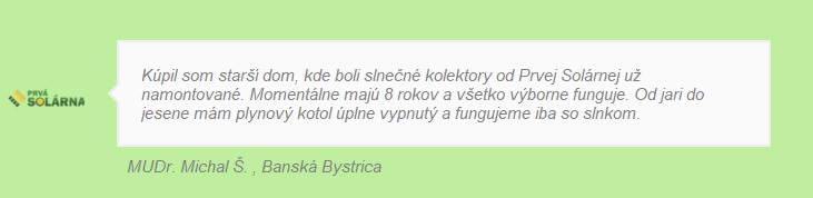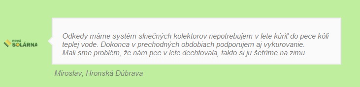 Slnečné kolektory premieňajú slnečné žiarenie na teplo – teplo tvorí až 83% energetických nákladov domácnosti. Práve preto sa výroba tepla domácnosti oplatí najviac. Životnosť kolektorov dosahuje až 30 rokov a jedná sa o spoľahlivé zariadenie fungujúce bez množstva elektroniky. Inštalácia je možná do akéhokoľvek domu – do novostavby aj do užívaného domu